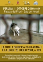 Nella cartellina consegnata ai partecipanti al convegno" La tutela giuridica degli animali e la legge 20 luglio 2004, n. 189" organizzato a Perugia dal Ministero della Salute in collaborazione con la Città di Perugia, il Tribunale degli Animali e dall'Associazione dalla A alla Zampa, c'era anche una brochure: " Con l'introduzione nel codice penale del titolo IX bis - Dei delitti contro il sentimento per gli animali, infatti, l'uccisione, il maltrattamento, il combattimento e l'abbandono degli animali sono stati riconosciuti come reati e sono quindi perseguibili penalmente. Attraverso un'efficace sinergia tra il Ministero della Salute, i Servizi veterinari territorialmente competenti, gli organi di polizia giudiziaria, la magistratura e le associazioni di protezione degli animali è possibile dare attuazione concretamente alle norme di tutela degli animali."
