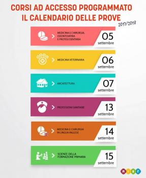 Sono state rese note dal MIUR le date di effettuazione delle prove di ammissione relative ai seguenti corsi di laurea e di laurea magistrale ad accesso programmato nazionale per l'anno accademico 2017/2018. Per i Medicina Veterinaria i test si svolgeranno il 6 settembre 2017 ma tutte le prove si svolgeranno entro le prime tre settimane di settembre.