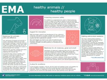 La brochure 'Healthy animals, healthy people’ spiega come l’EMA faciliti lo sviluppo di farmaci veterinari, rendendo più sicuro il contatto tra uomini ed animali e proteggendo la produzione di alimenti di origine animale.