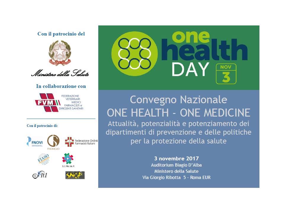 Il prossimo 3 novembre si celebrerà in tutto il mondo il “One Health Day”: un’iniziativa nata nel 2016 con l’intento di promuove l’applicazione di un approccio collaborativo, multidisciplinare, coordinato per affrontare i rischi potenziali o attivi che hanno origine dall’interfaccia ambiente-animali-ecosistemi umani. Con lo stesso intento il Ministero della Salute – in collaborazione con la FVM – ha organizzando un Convegno Nazionale “ONE HEALTH – ONE MEDICINE. Politiche per la promozione della salute. Attualità, potenzialità e potenziamento dei Dipartimenti di Prevenzione” considerando tali strutture aziendali il più avanzato esempio di organizzazione multi-specialistica a tutela della salute dei territori.