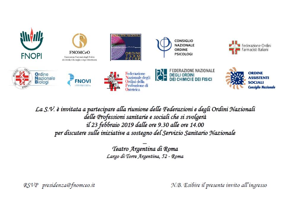 Sabato 23 febbraio dalle ore 9,30 alle ore 14 è in programma a Roma, presso il Teatro Argentina la prima assemblea nazionale degli Ordini e delle Federazioni di tutte le professioni sanitarie e sociali.