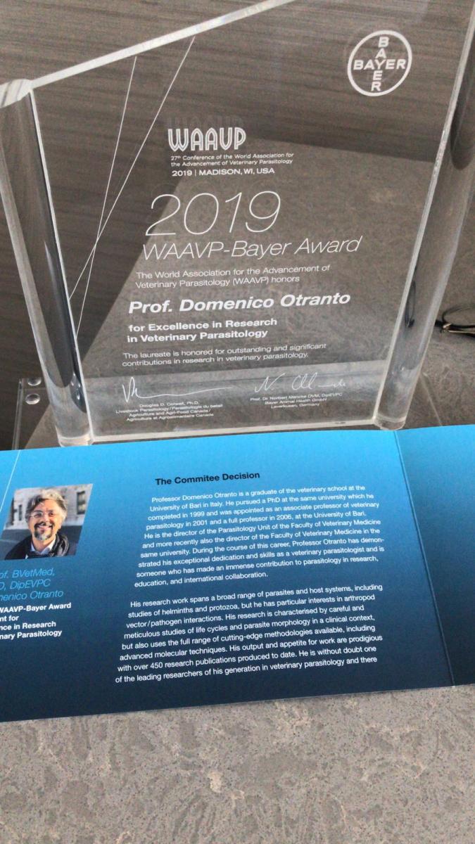 Il premio gli è stato conferito per gli studi nel campo della parassitologia di base e applicata a scienziati che si sono distinti per le loro ricerche nel settore, a favore della salute degli animali e dell'uomo. Le motivazioni hanno riguardato gli studi condotti dal Prof Otranto sulla biologia degli artropodi vettori di malattie parassitarie agli animali e agli uomini quali la leishmaniosi e le infestazioni da nematodi che parassitano gli occhi.