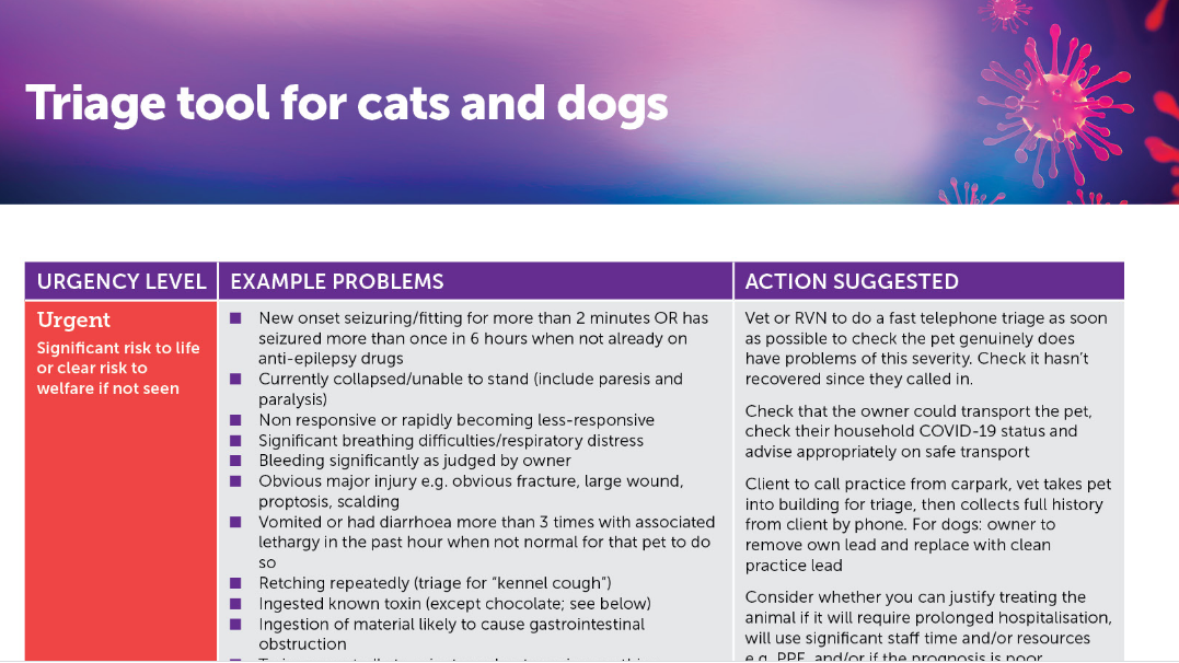 La British Small Animal Veterinary Association (BSAVA) ha realizzato una guida al triage indirizzata al personale delle strutture medico veterinarie nell'emergenza COVID-19.