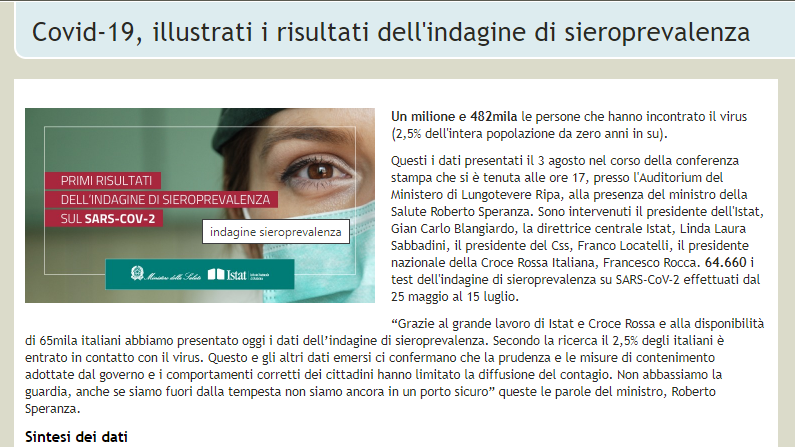 COVID-19, ILLUSTRATI I RISULTATI DELL'INDAGINE DI SIEROPREVALENZA