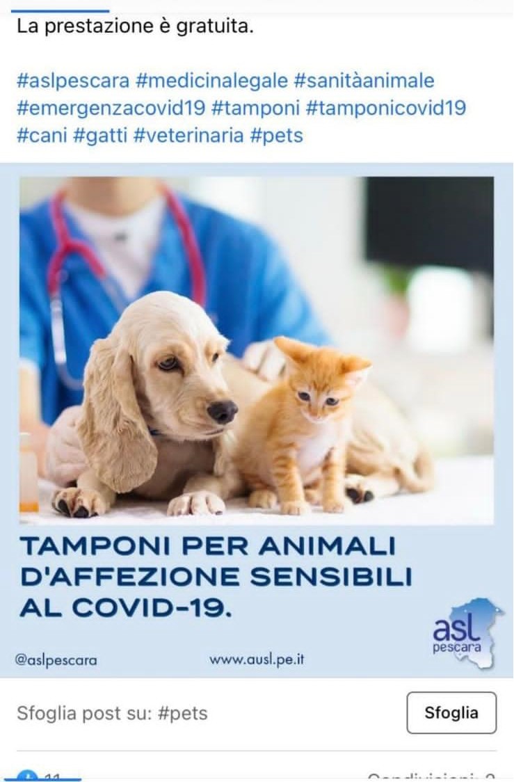 L’Ordine dei medici veterinari di Pescara ha inviato all’assessore alla Sanità della Regione Abruzzo una richiesta di precisazioni in merito alla campagna di tamponi gratuiti per gli animali dei nuclei familiari dove un componente è risultato positivo o si è ammalato di Covid-19 promossa dall’ASL tramite il servizio di Medicina Legale e il servizio veterinario di sanità animale.