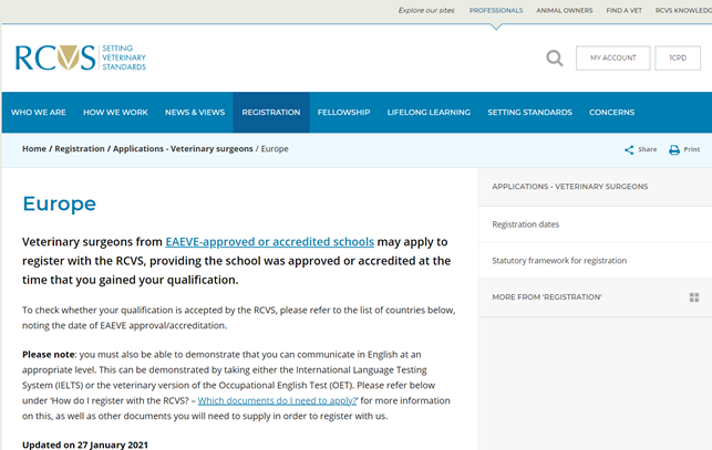 Il Royal College of Veterinary Surgeons, autorità competente nel Regno Unito per la professione medico veterinaria, ha recentemente pubblicato le regole da seguire per richiedere l’iscrizione, obbligatoria per l’esercizio della professione. L’uscita del Regno Unito dall’Unione Europea ha decretato la fine del muto e automatico riconoscimento dei titoli di laurea, che saranno ora valutati in base all’accreditamento EAEVE della facoltà dove sono stati ottenuti.