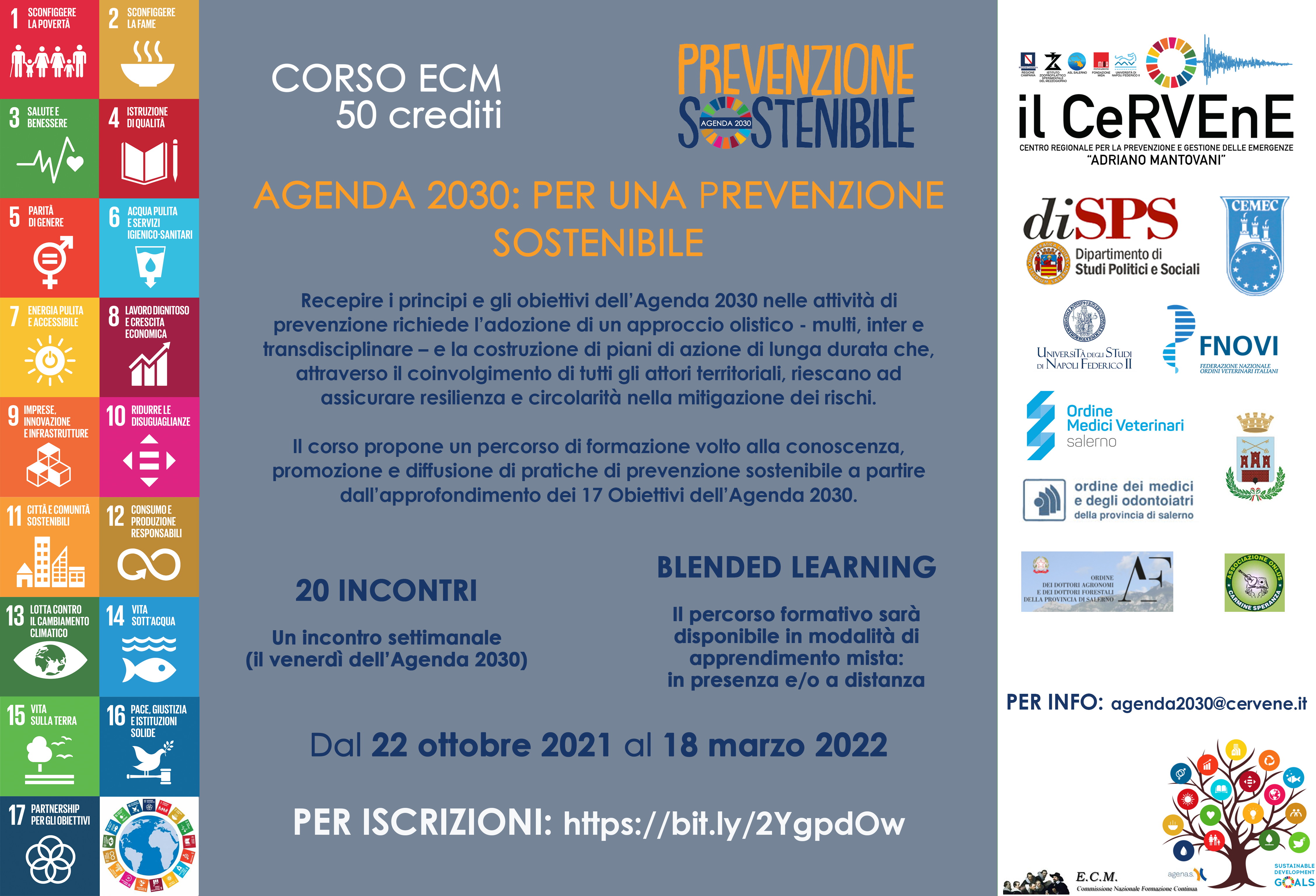 Il CeRVEnE, oggi Centro Regionale di Riferimento per la Prevenzione e Gestione delle Emergenze, con il supporto del Dipartimento di Studi Politici e Sociali (DISPS) dell’Università degli Studi di Salerno e della Fondazione MIdA (Musei Integrati dell’Ambiente), è impegnato nell’organizzazione di un Corso ECM sull’Agenda 2030. Il corso propone un percorso di formazione volto alla conoscenza, promozione e diffusione di pratiche di prevenzione sostenibile a partire dall’approfondimento dei 17 Obiettivi dell’Agenda 2030.