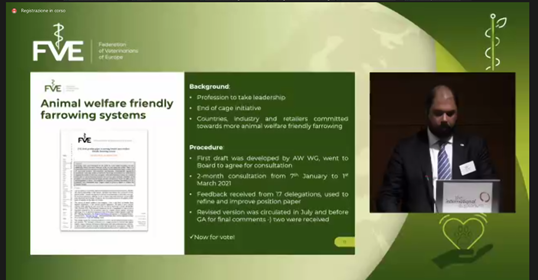 Giovabattista Guadagnini, delegato di FNOVI alla FVE, ha presentato, insieme alla neoeletta vice presidente FVE Mette Uldhal, i due nuovi position paper realizzati dall’Animal Welfare Working Group: Position paper on moving towards more animal welfare friendly farrowing systems e la FVE Animal Welfare Strategy.