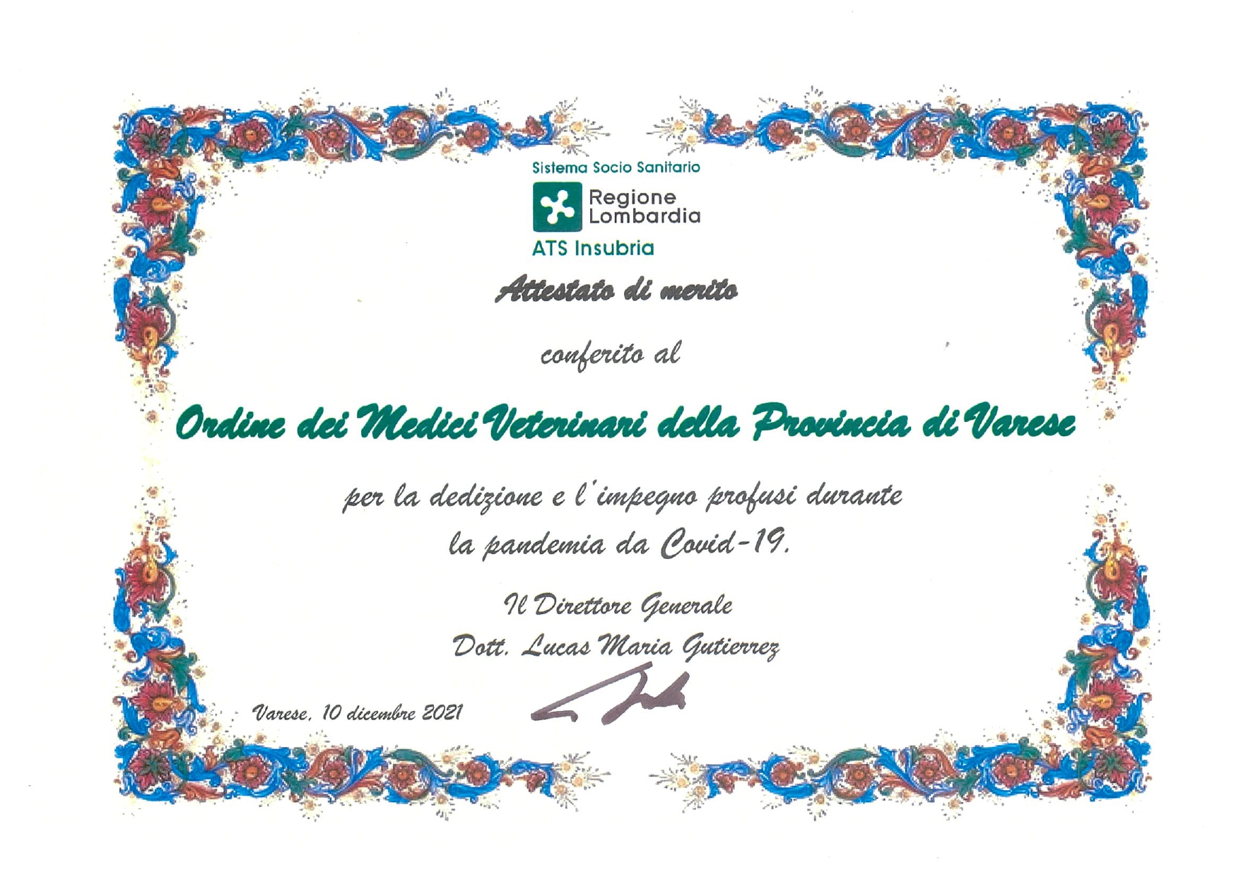 Maurizio Mazzucchelli, presidente dell'Ordine dei medici veterinari della provincia di Varese, informa che lo scorso 10 dicembre, in occasione della commemorazione delle vittime dell’infezione da SARS-CoV-2, l'ATS INSUBRIA ha consegnato un “Attestato di merito” all’Ordine Medici Veterinari della Provincia di Varese , con l’intento di ringraziare tutti i Medici Veterinari della Provincia “per la dedizione e l’impegno profusi durante la pandemia da COVID 19.”