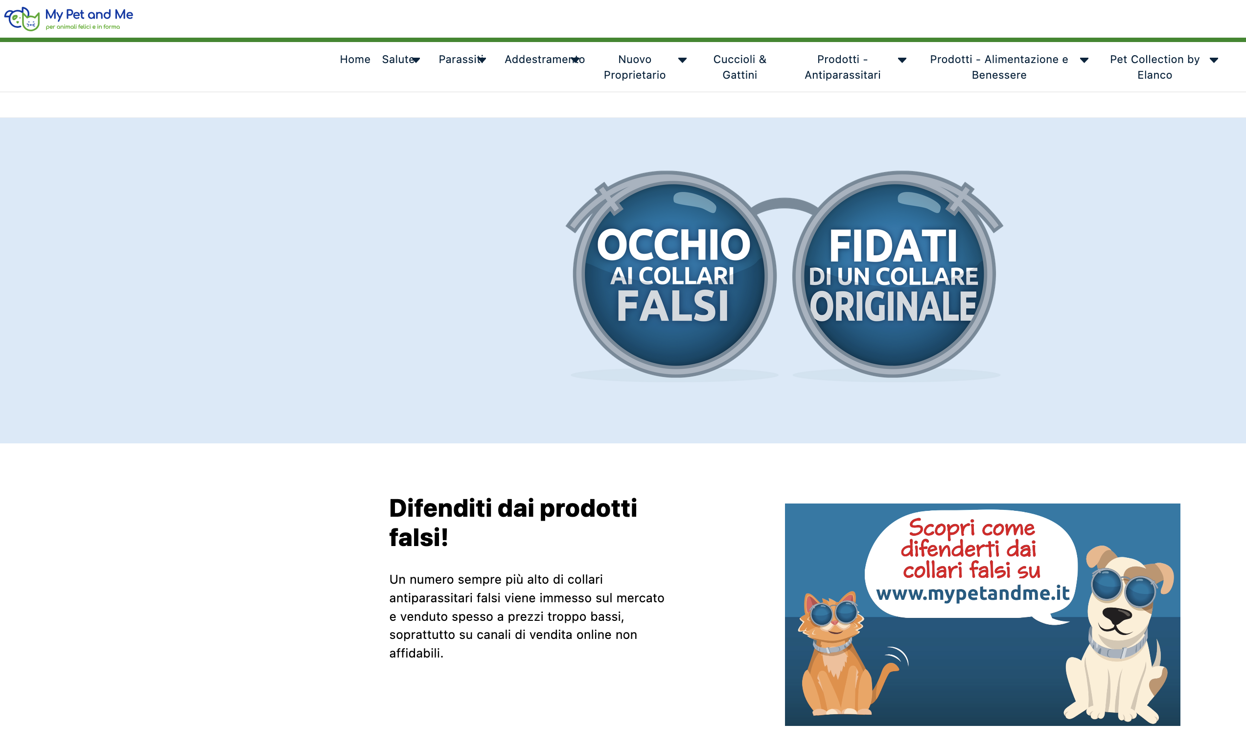 Il sito web ospita Occhio ai falsi (mypetandme.elanco.com/it/collare-falso), una sezione con indicazioni utili a riconoscere i collari originali e orientarsi verso scelte consapevoli. Le azioni prevedono anche la collaborazione con le autorità per contrastare la diffusione dei prodotti falsi.