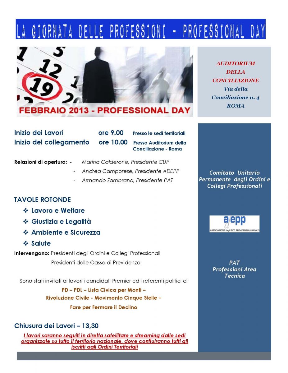Si terrà il 19 febbraio prossimo a Roma presso l'Auditorium della Conciliazione - a partire dalle ore 9:30 - la giornata delle professioni, organizzata da CUP, ADEPP e PAT. Anche la FNOVI parteciperà alla seconda edizione di questo evento che vuole essere un “confronto pubblico sulle prospettive di crescita del Paese e sul ruolo che i 2.300.000 iscritti agli Ordini e collegi professionali italiani svolgono quotidianamente a supporto dei cittadini e della Pubblica Amministrazione”. Il comunicato stampa relativo al Professional Day, diramato in queste ore, annuncia che la manifestazione vanterà la “presenza dei Presidenti e dei Consiglieri nazionali delle varie professioni con collegamenti in diretta via satellite con le sedi organizzate a livello territoriale, dove parteciperanno non meno di 500.000 professionisti appartenenti a tutti gli ordini e collegi professionali italiani”.