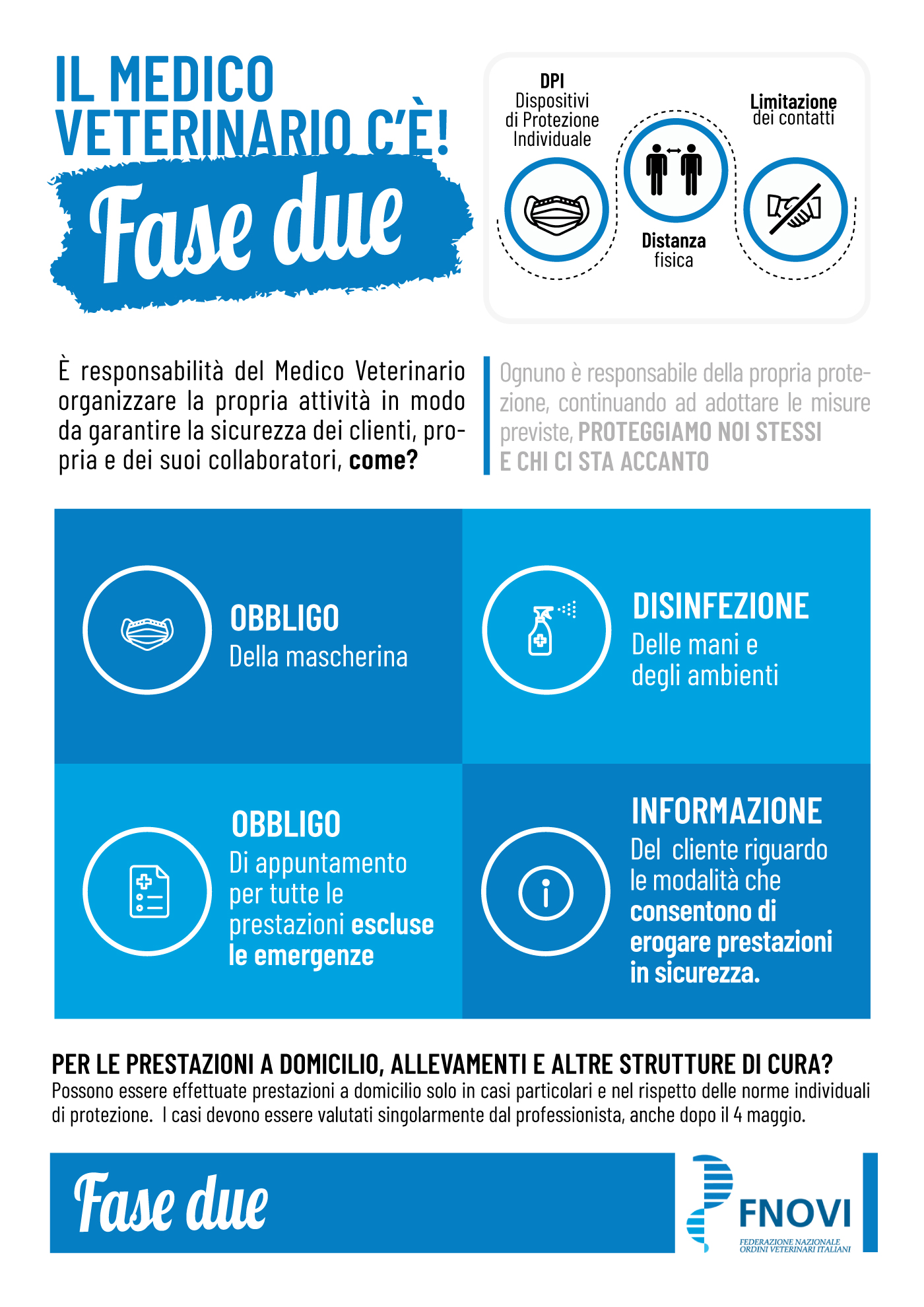 Per schematizzare in modo chiaro e immediatamente comprensibile le indicazioni già fornite Fnovi ha realizzato una nuova info grafica. I medici veterinaria anche nella Fase 2 ci sono e continuano a garantire la salute e il benessere degli animali.