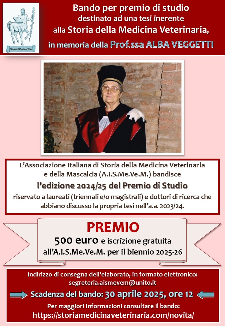 Nell’ottica di favorire l’avvicinamento dei neolaureati (triennali e/o magistrali) e dei giovani dottori di ricerca alla Storia della Medicina veterinaria, l'Associazione Italiana di Storia della Medicina Veterinaria e della Mascalcia (AISMeVeM) ha bandito l'edizione 2024-2025 del Premio di Studio intitolato alla Professoressa Alba Veggetti, figura tra le più autorevoli dell’Università italiana degli ultimi decenni, già prima Presidentessa della Sezione di Storia della Medicina Veterinaria del Centro Italiano di Storia Sanitaria e Ospitaliera.