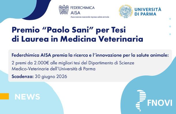 Grazie alla collaborazione con il Dipartimento di Scienze Medico-Veterinarie dell’Università degli Studi di Parma, sono stati istituiti due premi di laurea, ciascuno del valore di 2.000 euro, per i prossimi 5 anni, destinati alle Tesi di Laurea in Medicina Veterinaria che si distinguano per il contributo innovativo nei tre ambiti fondamentali: innovazione nel settore degli animali produttori di alimenti per l’uomo, innovazione nel settore degli animali da compagnia e Salute Globale.